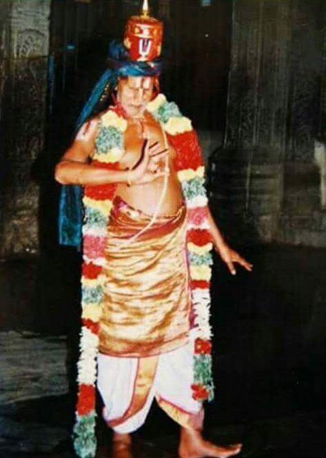 Nathamunigal was also an expert in the arts of music and dance. Once when there was a dispute around a particular divine tune, Nathamuni played several cymbals (a percussion instrument) and determined the weight of each cymbal from the sound pitch they produced. Such was his musical prowess. During his time at Srirangam, he taught his nephews Melai Agathaazhwaan and Keezhai Agathaazhwaan, all the 4000 hymns along with musical tunes. He also developed mudras and dance movements to explain the intricate meanings of these verses. Thus begun the Araiyar Sevai tradition which continues to date.